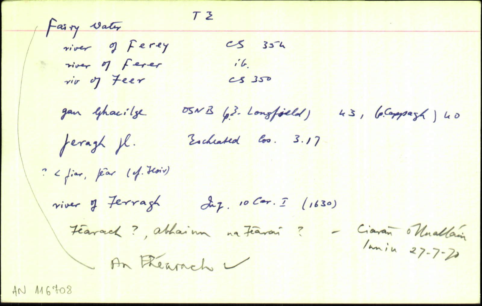 Aire: Cáipéisíocht áirithe chartlainne de chuid an Bhrainse Logainmneacha í seo. Léirítear anseo cuid de réimse thaighde an Bhrainse Logainmneacha ar an logainm seo thar na blianta. D'fhéadfadh sé nach taifead iomlán é agus nach bhfuil aon rangú in ord bailíochta déanta ar an bhfianaise atá ann. Is ar an tuiscint seo atá an t-ábhar seo á chur ar fáil don phobal.