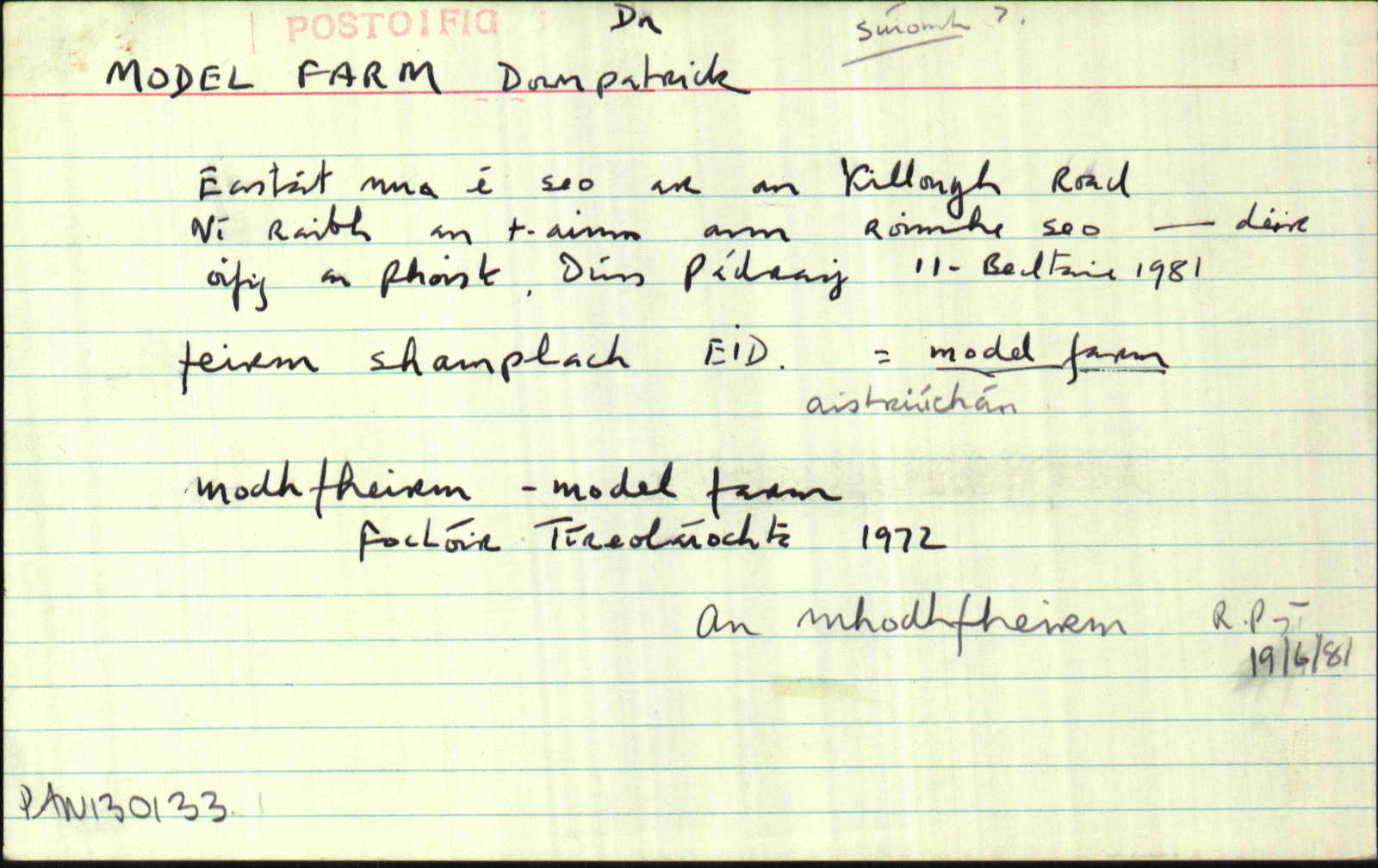 Aire: Cáipéisíocht áirithe chartlainne de chuid an Bhrainse Logainmneacha í seo. Léirítear anseo cuid de réimse thaighde an Bhrainse Logainmneacha ar an logainm seo thar na blianta. D'fhéadfadh sé nach taifead iomlán é agus nach bhfuil aon rangú in ord bailíochta déanta ar an bhfianaise atá ann. Is ar an tuiscint seo atá an t-ábhar seo á chur ar fáil don phobal.