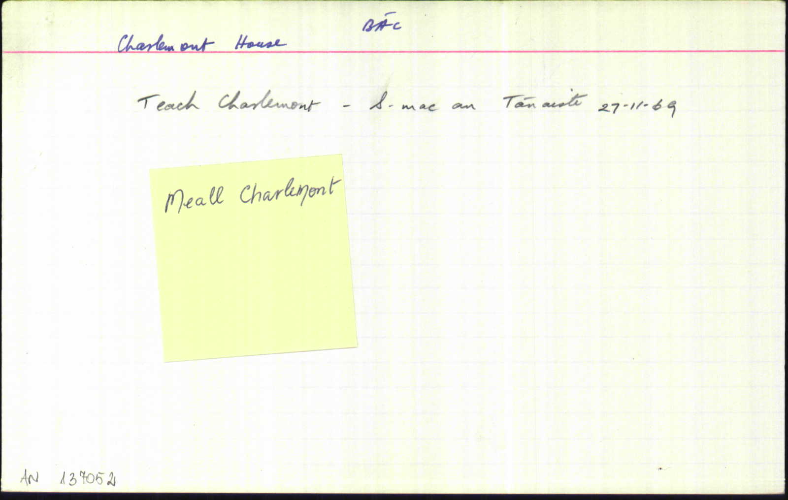 Aire: Cáipéisíocht áirithe chartlainne de chuid an Bhrainse Logainmneacha í seo. Léirítear anseo cuid de réimse thaighde an Bhrainse Logainmneacha ar an logainm seo thar na blianta. D'fhéadfadh sé nach taifead iomlán é agus nach bhfuil aon rangú in ord bailíochta déanta ar an bhfianaise atá ann. Is ar an tuiscint seo atá an t-ábhar seo á chur ar fáil don phobal.